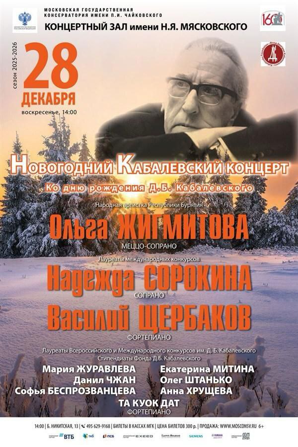 «Светлое имя Д.Б. Кабалевского нам помогает и нас обязывает, — писал о Дмитрии Борисовиче народный художник России Борис Неменский. "Для реального осуществления всех его мечтаний и идей необходимо вдохновенное творчество, убежденность и созидательная деятельность!»Эти слова как нельзя лучше отражают дух предстоящего концерта, где ученики и последователи композитора — лауреаты конкурсов его имени и стипендиаты Фонда Кабалевского представят его музыкальное наследие. Концерт станет ярким свидетельством того, что педагогические идеи Кабалевского продолжают жить и вдохновлять новые поколения. Концерт пройдёт 28 декабря в 14:00. Билеты доступны по Пушкинской карте.