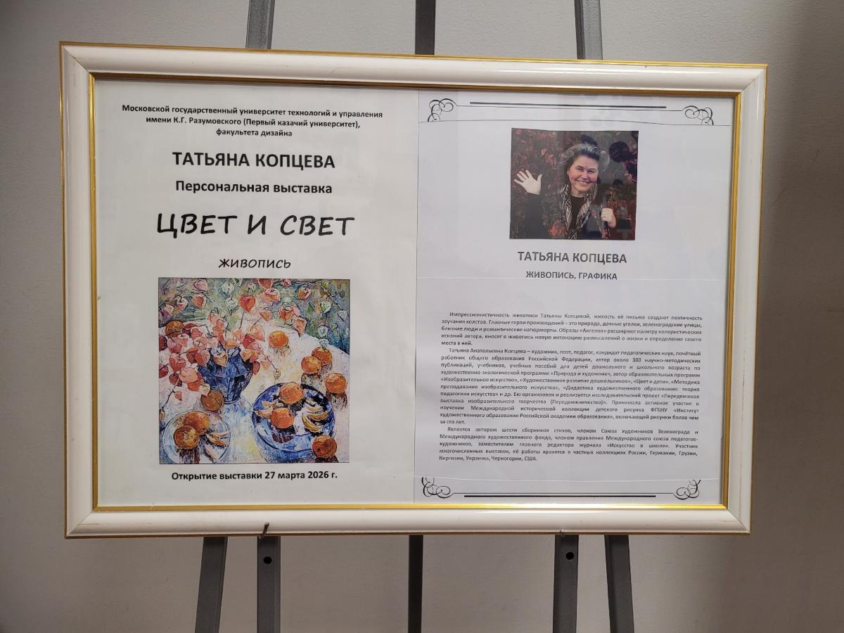 27 марта 2026 г. в Московском государственном университете технологий и управления имени К.Г. Разумовского (Первый казачий университет), на факультете дизайна состоялось открытие персональной выставки «ЦВЕТ и СВЕТ» Татьяны Анатольевны Копцевой, заместителя главного редактора журнала «Искусство в школе».члена Московского союза художников и Международного союза педагогов-художников.