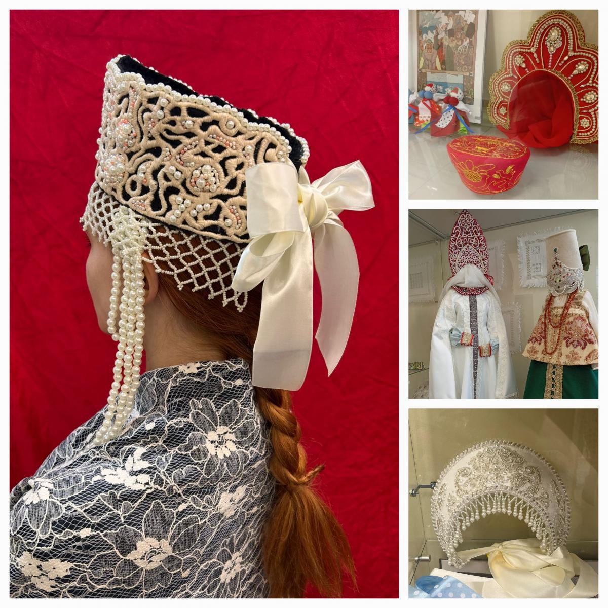 В экспозиции представлены кокошники Ярославской, Московской, Костромской, Нижегородской, Архангельской губерний, а также уникальная рогатая кикаРязанской губернии — древний головной убор замужних женщин, символизирующий плодородие и достаток. Рядом с ними — головной убор некрасовской казачки и карельский народный костюм, показывающий переплетение финно-угорских и славянских традиций.
